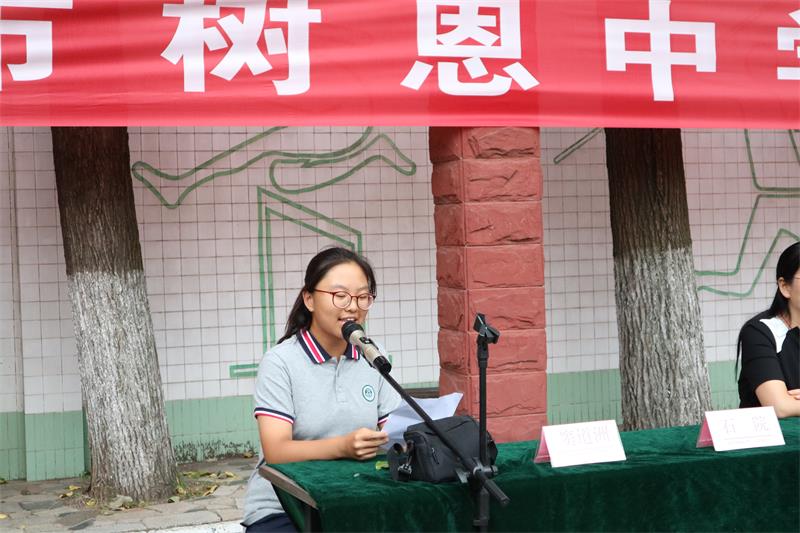 七1班孔智琳同学发言:我们踏着九月的金色阳光,迈入了树恩中学的大门,心中有说不尽的自豪与喜悦