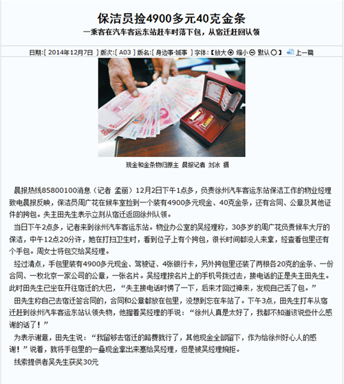 徐州hth(中国)有限公司官网物业拾金不昧受称赞