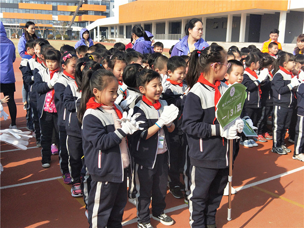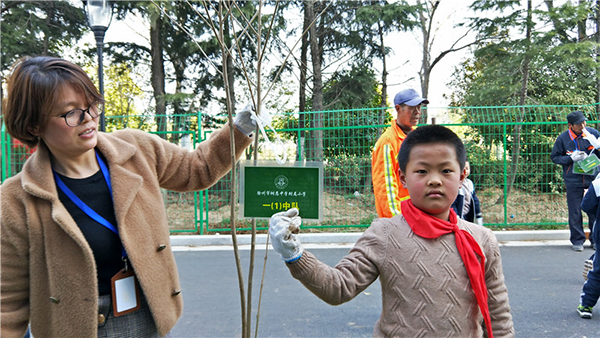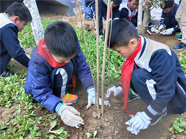 同学们身穿运动服校服,佩戴着红领巾,挖坑、植苗、填土、挂牌……那一个个忙碌的身影俨然成为一道风景线。